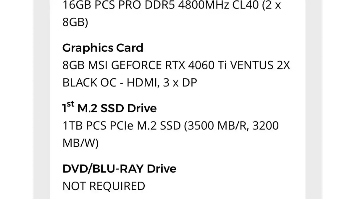 Veuillez noter que je ne veux que cet ordinateur pour jouer occasionnellement à wz/fortnite mais principalement je joue à un mmorpg de 20 ans, c’est ce à quoi j’étais initialement venu acheter. Après avoir écouté certains conseils, j’ai apporté quelques modifications, pourrais-je obtenir quelques avis ? J’ai changé le processeur en amd ryzen 5 7500f, la carte mère en b650 plus wifi, la mémoire vive en 32go ddr5 6000mhz cl36 (2x16go), la carte graphique en rx7700 xt gaming, le ssd en 1to solidigm pro gen 4 m.2 NVMe 7000mb/s R 6500MB/sW