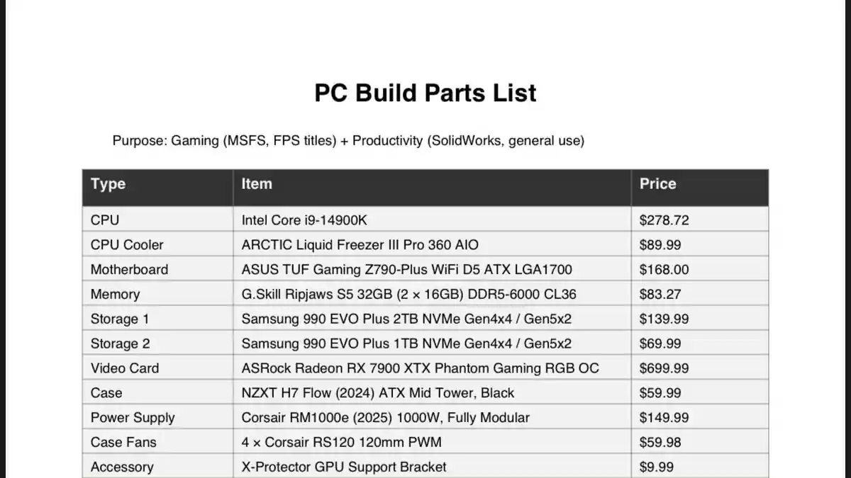 Je prendrais un 9070XT (sauf que vous avez besoin de 24 Go de VRAM) et un 9800x3d (sauf que vous avez besoin de nombreux cœurs, ensuite le 9900/9950/9900X3D) au lieu de cela si c’est plus orienté jeux. Aussi, prenez de la mémoire CL30