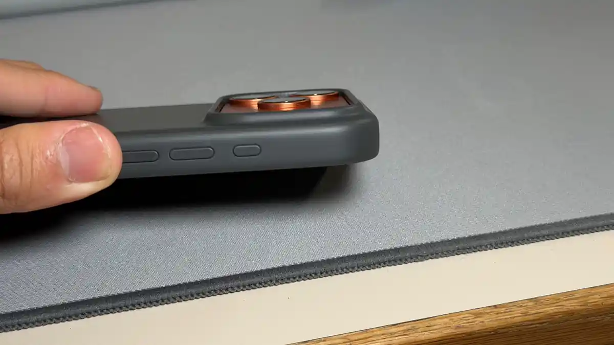 Malgré ce que j’avais vu en ligne précédemment à propos de cette coque, elle a en fait assez bonne adhérence. Pas autant qu’une coque en silicone, mais pas non plus super glissante comme la coque claire d’Apple, quelque part entre les deux. La texture ressemble presque à celle du cadre en aluminium de l’iPhone, mais un peu plus antidérapante ici et évidemment faite en plastique. Elle est très légère sur le téléphone lui-même, tous les boutons s’adaptent parfaitement et fonctionnent très bien.