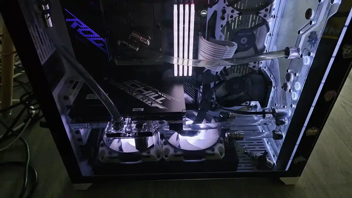 Custom cooling loop with one 360 and one 240 mm radiators.