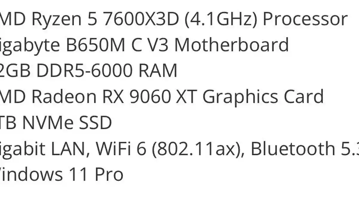Configuration PowerSpec : https://www.microcenter.com/product/696256/G525_Gaming_PC;_AMD_Ryzen_5_7600X3D_41GHz_Processor;_AMD_Radeon_RX_9060_XT_16GB_GDDR6;_32GB_DDR5-6000_RAM;_1TB_Solid_State_Drive;_Microsoft_Windows_11?_gl=1*hdx0sh*_gcl_au*MTQ4NjY5MzM2LjE3NTc4MzIwODI.*_ga*MTM3ODAzODk4MS4xNzU3ODMyMDgx*_ga_CSBPEX4VCV*czE3NTg5NTAzNjYkbzMyJGcxJHQxNzU4OTUyODU1JGo2MCRsMSRoMTcyMTMzMDY1
