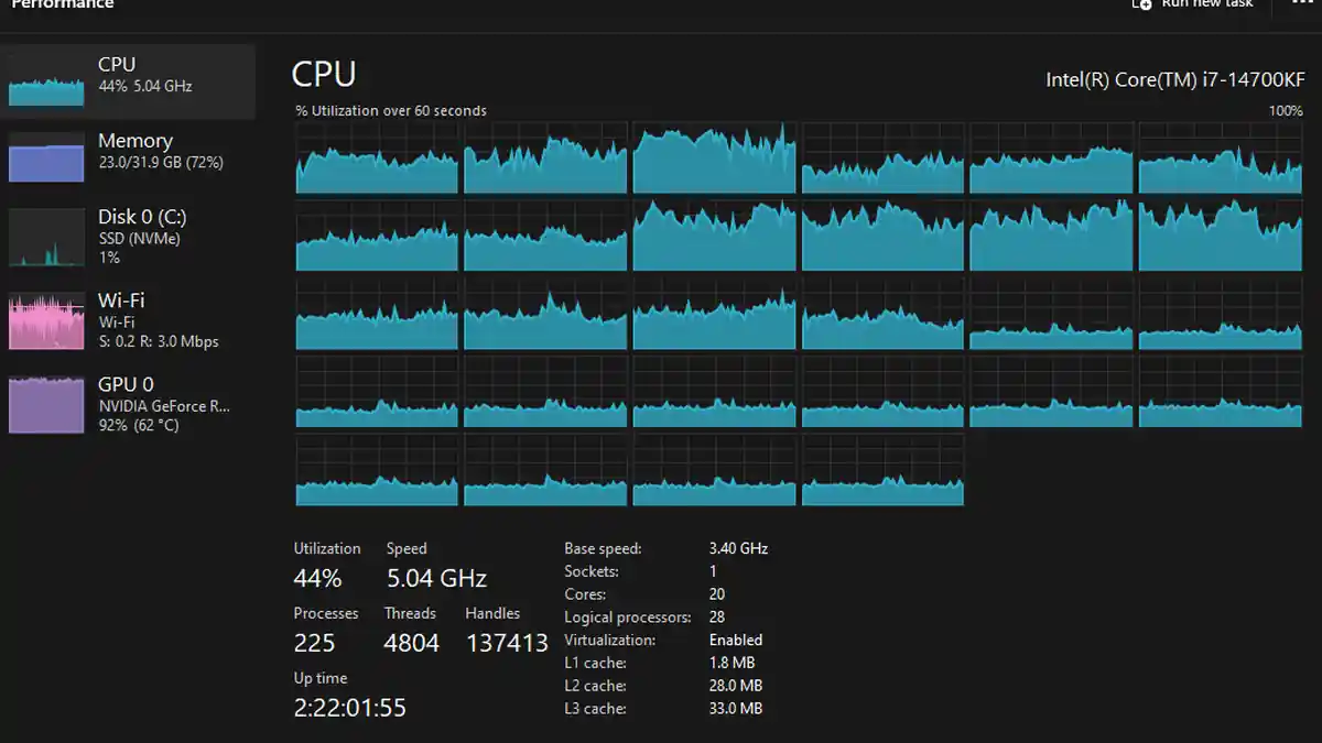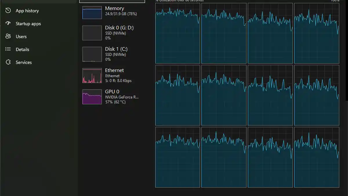 Donc ce que je veux attirer votre attention, c’est sur les graphiques d’utilisation du CPU. J’ai remarqué que les saccades se produisent lorsque j’atteins une utilisation à 100 % (ou proche). Mon ami, en revanche, n’a eu aucun problème. Lorsque je regarde sa capture d’écran, j’ai remarqué qu’il y a 16 threads qui sont fortement utilisés, alors que les autres 12 restent en dessous de 30 %.