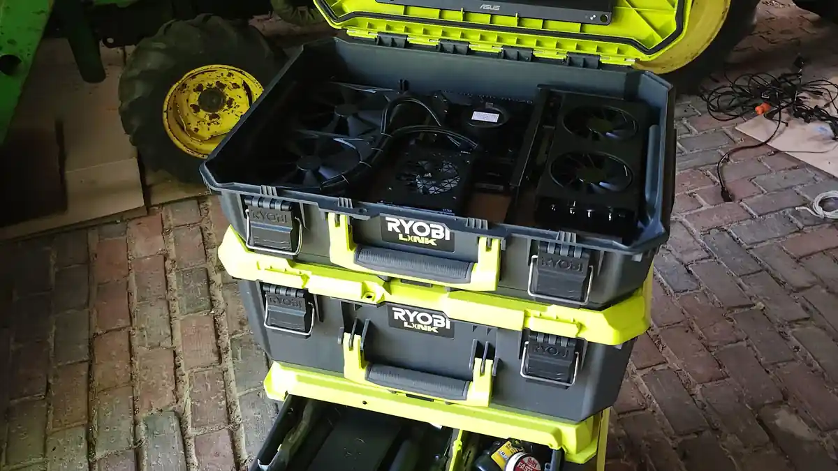 J’habite dans une petite maison sur remorque où l’espace est toujours limité et où le modulaire et le rangement sont rois. Alors, cet été, je me suis construit un PC de jeu mobile tout-en-un dans le plus petit conteneur du système Ryobi Link Packout. La semaine dernière, pour me faire plaisir, j’ai fait une grosse mise à niveau en y installant un processeur 7900 et une carte graphique 9070, puis je lui ai appliqué la mod Noctua complète. Maintenant que c’est terminé, je transfère le 7500F et le 9060 qui s’y trouvaient auparavant dans un boîtier mobile dans le plus grand casier du bas du Ryobi Link, qui fonctionnera comme un home lab mobile et un espace de stockage, avec deux PC à accès distant à l’intérieur : un pour l’IA et un pour le piratage.
