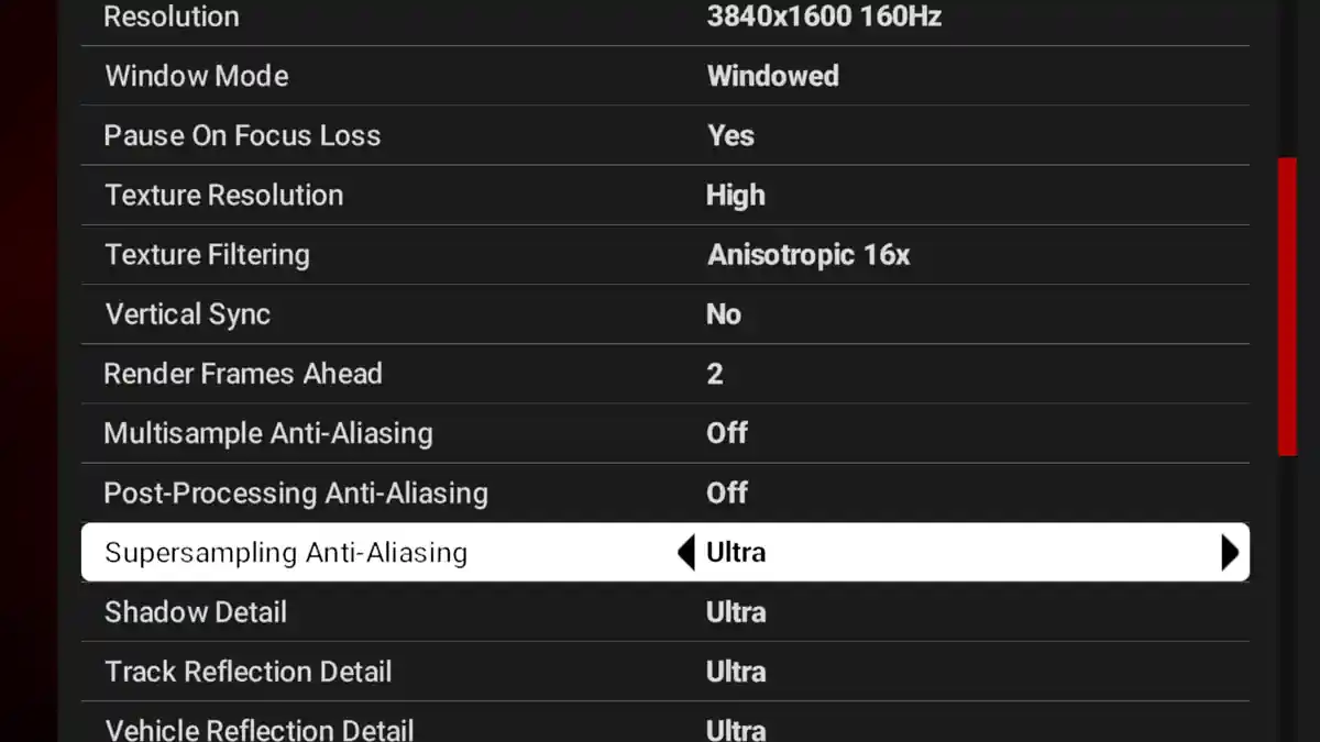 J’ai consulté beaucoup d’informations et après avoir joué avec toutes les combinaisons possibles des paramètres graphiques du jeu, les meilleurs résultats sont obtenus avec juste SSAA à ultra, comme suit :