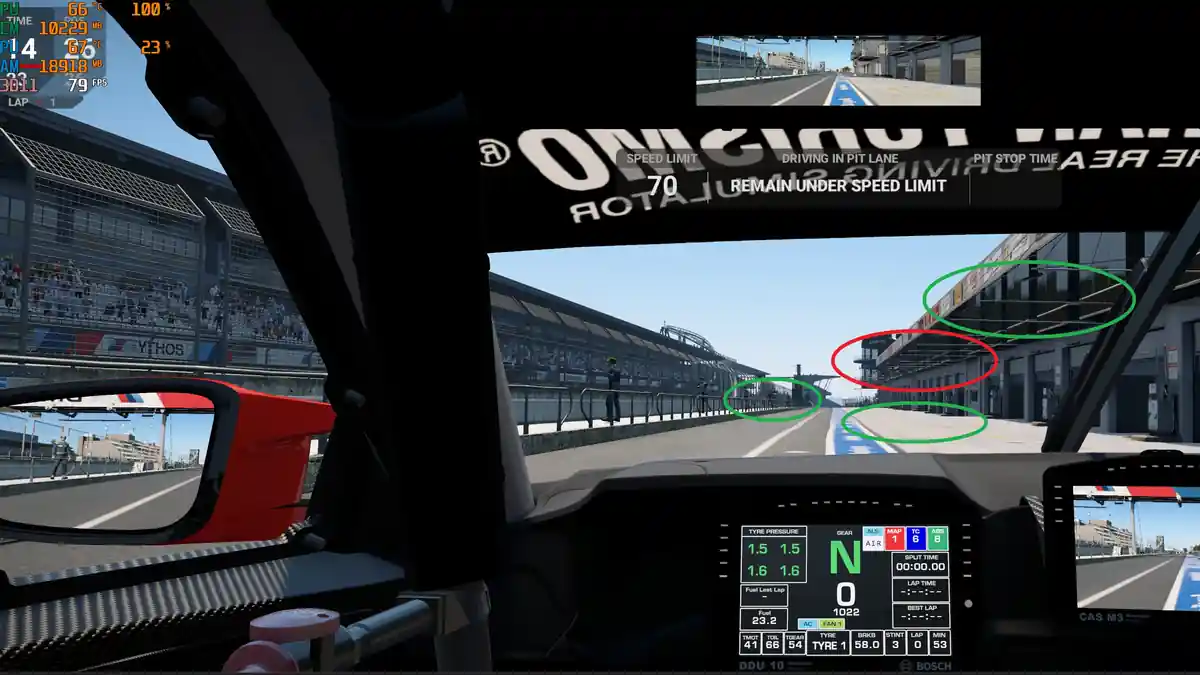 Dans ces conditions, je n’ai qu’un scintillement dans la zone du cercle rouge, dans les cercles verts le scintillement n’est pas présent. Bien sûr, cela s’est accompagné d’une chute extrême des FPS, comme vous pouvez le voir sur l’écran (79 FPS), mais même ainsi, j’ai toujours un scintillement clair dans la zone du cercle rouge. J’ai également essayé de modifier les paramètres de AA du panneau de configuration Nvidia, en testant toutes les combinaisons, aucune d’entre elles ne fait rien de notable. La seule qui améliore légèrement le scintillement est d’utiliser un facteur de résolution DSR plus élevé dans le jeu, ce qui améliore légèrement le scintillement dans le cercle rouge, mais il est toujours présent clairement, et bien sûr les FPS baissent encore davantage vers les 30…