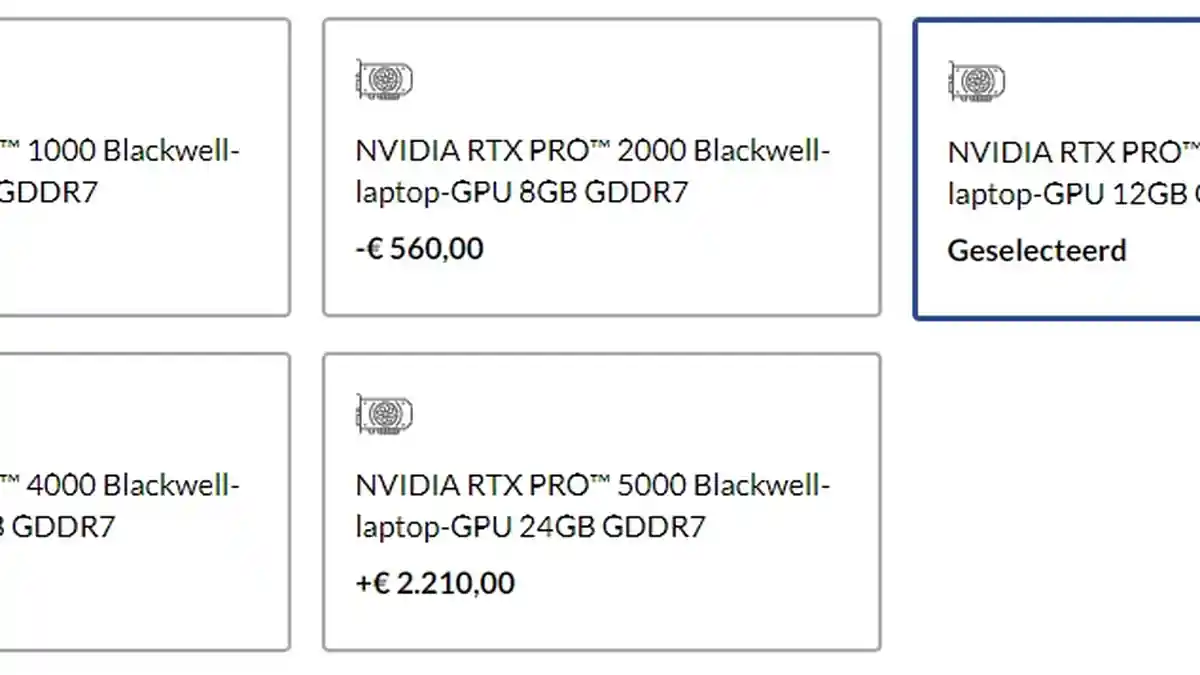 L’ordinateur portable propose la nouvelle série RTX PRO. Les coûts d’upgrade par rapport au modèle de base **RTX 3000 (12 Go)** sont :